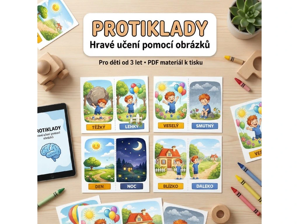 Povídejte si s dětmi o jednotlivých obrázcích, pojmenovávejte protiklady a zkuste společně hledat další příklady z běžného života. Dítě tak nebude jen opakovat slova, ale opravdu pochopí jejich význam.